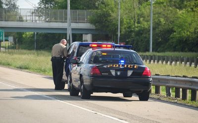 A woman driver is speeding along the highway, when she is suddenly stopped by an officer.